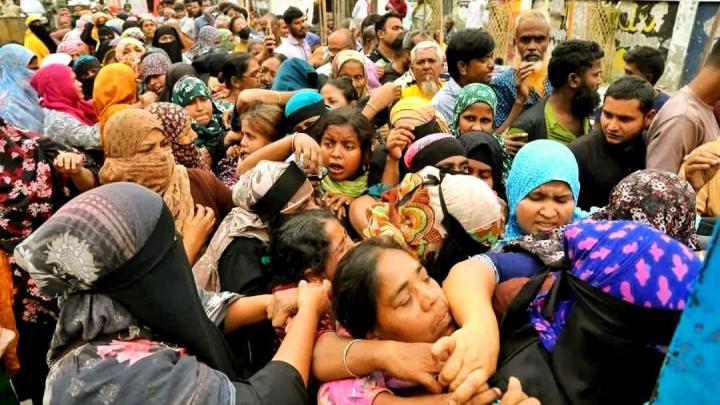 ভিড় সামাল দিতে গিয়ে ট্রাকচালক সামনে এগিয়ে যাওয়ার চেষ্টা করলে পরিস্থিতি আরও বিশৃঙ্খল হয়ে পড়ে। ক্ষুধার তাড়নায় মানুষ চলন্ত ট্রাকের পেছনে ছুটতে থাকে। পরিবারের মুখে দুমুঠো অন্ন তুলে দেওয়ার মরিয়া চেষ্টায় কেউ কেউ ট্রাকের পেছনের অংশ ধরে ঝুলে পড়ে। এ সময় এক নারী ছিটকে পড়ে গিয়ে রাস্তায় আহত হন।.
